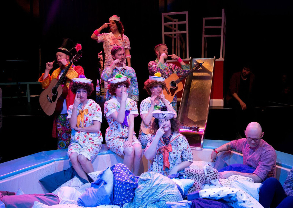 The Hypocrites cross-cast this entire show turning the trope of shipboard romance on its ear. Dana Omar as Ralphina is bright-eyed and lovely opposite Doug Pawlik’s wide-eyed Joseph. Emily Casey plays a practical yet ever-so-kind Captain Cat Coran. Christine Stulik is knee-slappingly hilarious as Admiral Dame Jo-Anne Porter. Kate Carson-Groner is delightfully confusing with the curmudgeonly Dot Dead-Eye. Matt Kahler plays L’il Buttercup like no one you’ve ever seen before. Erin O’Shea, Eric Schroeder, and Shawn Pfautsch run support and background vocals without fading into the background. All these performers showcase amazing energy and depth; accompanying themselves on an assortment of instruments from guitars, banjos, ukuleles, oboes, and one well-placed snare drum for a late-act-2 surprise rim shot.