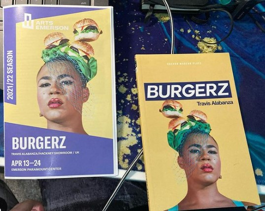 The ArtsEmerson “BURGERZ” playbill next to a copy of the “BURGERZ” script.