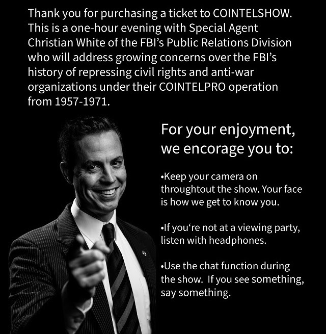 Or, Cointelshow might not have been the right fit for this attendee. Zoom theatre is not for all comers. That’s okay, too. No matter what your theatre preferences are, the government is watching you anyway.