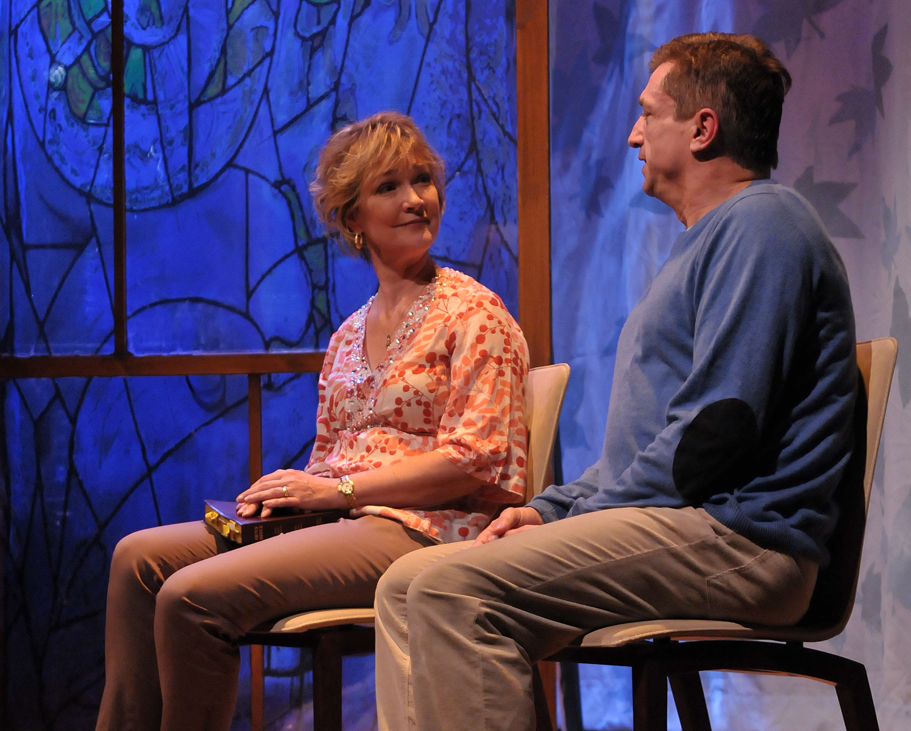 Arlene (Amelia Broome) chats with her son’s partner Adam (Will McGarrahan) in a hospital chapel in a scene from the SpeakEasy Stage Company production of Next Fall, running now thru Oct. 15, Photo: Craig Bailey/Perspective Photo.