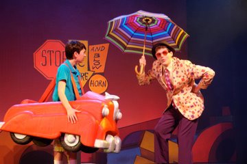 This nonsense world brings to mind the strange settings of Alice in Wonderland and The Wizard of Oz. It will delight kids who respond well to topsy-turvy logic. Those who don’t may find some annoyance in the otherwise delightful Dr. Dischord (Wayne Fritsche) and his caravan of loud sounds or the opinion-based identity of the Midget-Giant (Robert Saoud) and his attempts to confuse our heroes.