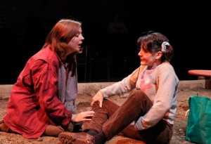 Lorna Nogueira’s transformation from a six-year old to a woman is so striking that it takes a moment to realize those characters are being performed by the same actress. Becca A. Lewis’ characters range in age from a teenager to a ninety year old woman with each character fully realized and performed. Her portrayal of the ninety year old woman contrasts sharply with the young girls and provides a tight connection between these characters even though the ninety year old woman only appears once in the play. Jen O’Connor’s characters range from embittered and sadistic to strong and supportive. As the stepmother of the teenager (played by Becca Lewis) who feels trapped in her life with little pleasure, her character finds pleasure in torturing and teasing her step-daughter. O’Connor’s actions are so frightening that at first the initial shock has to wear off before one can even begin to “swallow” what she has to offer. Anna Waldron plays all of her roles with authority whether as a Japanese businessman, a grandmother, or a supervisor on a farm. Each realistic portrayal by each cast member adds to the fully developed and realized production by Whistler in the Dark.