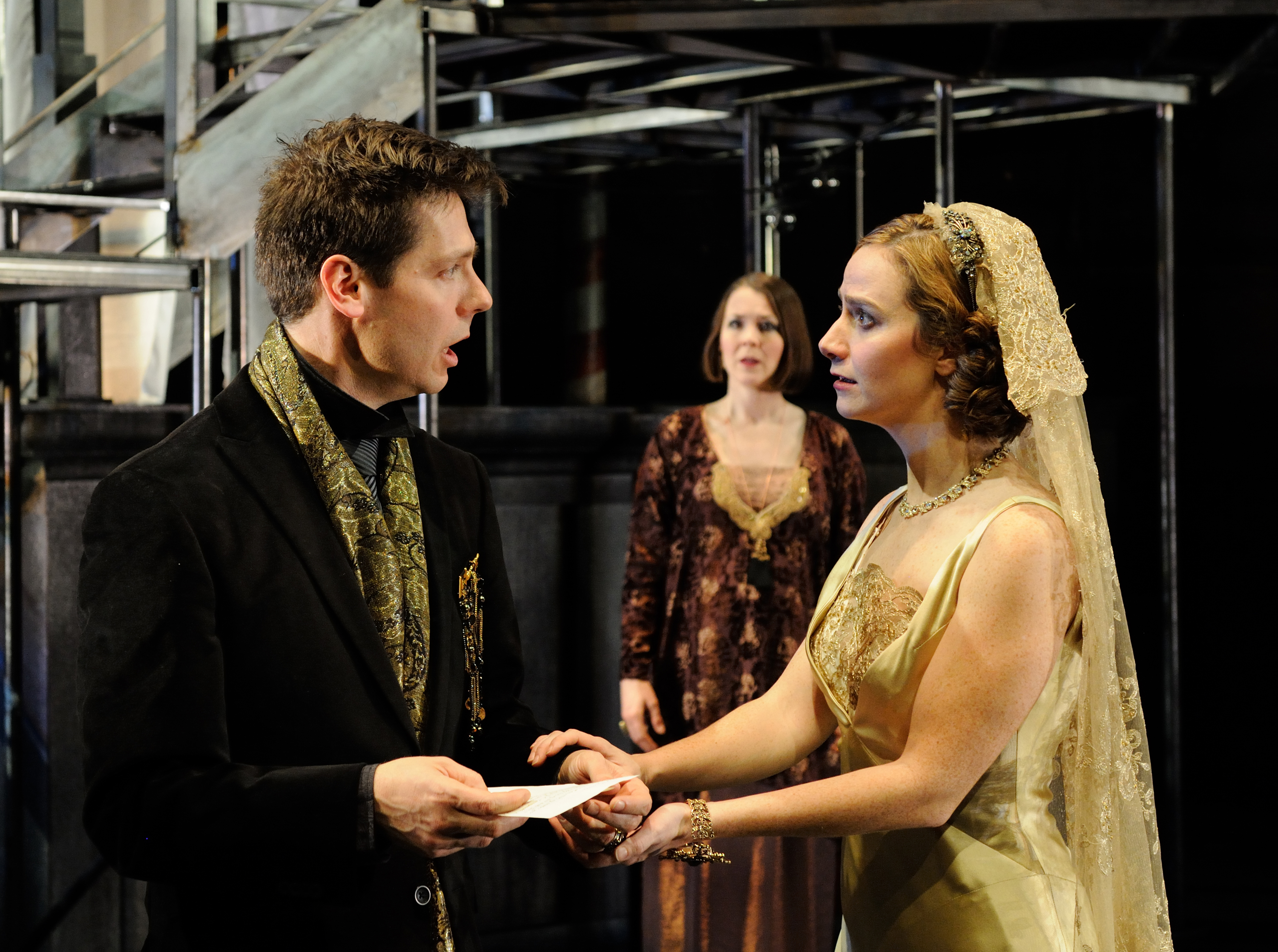 No one in Renaissance England would have questioned the anti-Semitic tone of Merchant of Venice. By that time, the Jews had been driven out of Europe and were primarily living in the Middle East. Trinity’s production, set in the twenties, remains true to Shakespeare’s vision since Jews were being placed in ghettos in Europe by the 1930s. That said, Merchant of Venice is as anti-Semitic as Othello is racist. Curt Columbus, the director of this play, makes it clear in the program that Shylock’s story is one of faulty choices by a man and that Shylock’s religion has nothing to do with that decision. Bassanio (Stephen Thorne), a consummate playboy, gets his friend Antonio to borrow money from Shylock on his behalf so that he might woo Portia, the heiress in Belmont. While Bassanio definitely has an affinity for Portia, he states that his main reason for marriage is to pay off his debts. Stephen Thorne effectively plays the “Tom Cruise” like Bassanio with slickness and charm. His compatriate, Gratiano (Fred Sullivan, Jr.) helps keep him in a “frat boy” state of mind. The minor foolish characters of Darien Battle are funny, but two dimensional and don’t provide distinction between the different characters. Sullivan, Jr. also falls into this trap as one of Portia’s suitors.