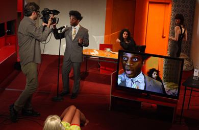 (Boston) Jay Scheib’s World of Wires is a live-cinema presentation that utilizes the mediums of television, live theater, the internet, music and all manners of spectating. It is an exhibition that posits that human experience on the internet is both defined by and created through actual and simulated human interaction. The result is a chaotic melodrama birthed by an obsessive zeitgeist.