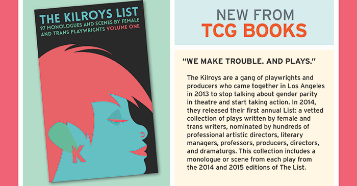 From the TCG website: “Theatre Communications Group (TCG) is pleased to announce the publication of The Kilroys List: 97 Monologues and Scenes by Female and Trans Playwrights, Volume One. The Kilroys are a gang of playwrights and producers who came together in Los Angeles in 2013 to stop talking about gender parity in theatre and start taking action. In 2014, they released their first annual List: a vetted collection of plays written by female and trans writers, nominated by hundreds of professional artistic directors, literary managers, professors, producers, directors, and dramaturgs. This collection includes a monologue or scene from each play from the 2014 and 2015 editions of The List.”