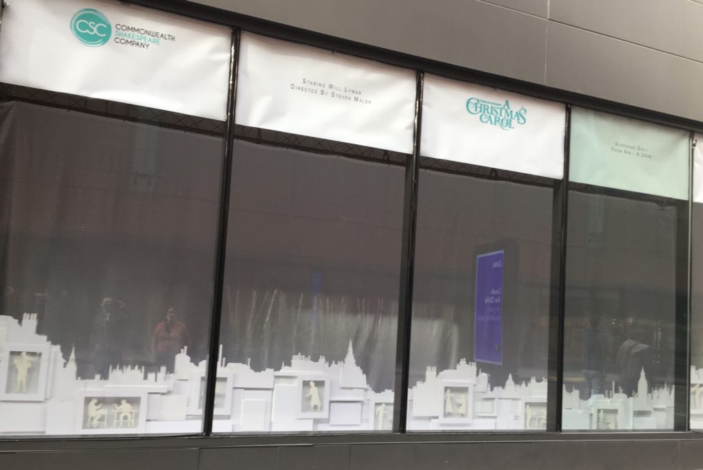 Our first stop was the Commonwealth Shakespeare Company’s design for their currently running production of “A Christmas Carol.” CSC says on its website that the production is “presented in a reduced 40-minute adaptation, and features a recorded solo performance by award-winning Boston actor Will Lyman, directed by CSC Founding Artistic Director Steven Maler.” Between the hours of 4pm – 9:30pm, Victorian London is brought to life through video projections that light up the storefront. Audiences can view the production from the sidewalk, and can watch at their leisure.