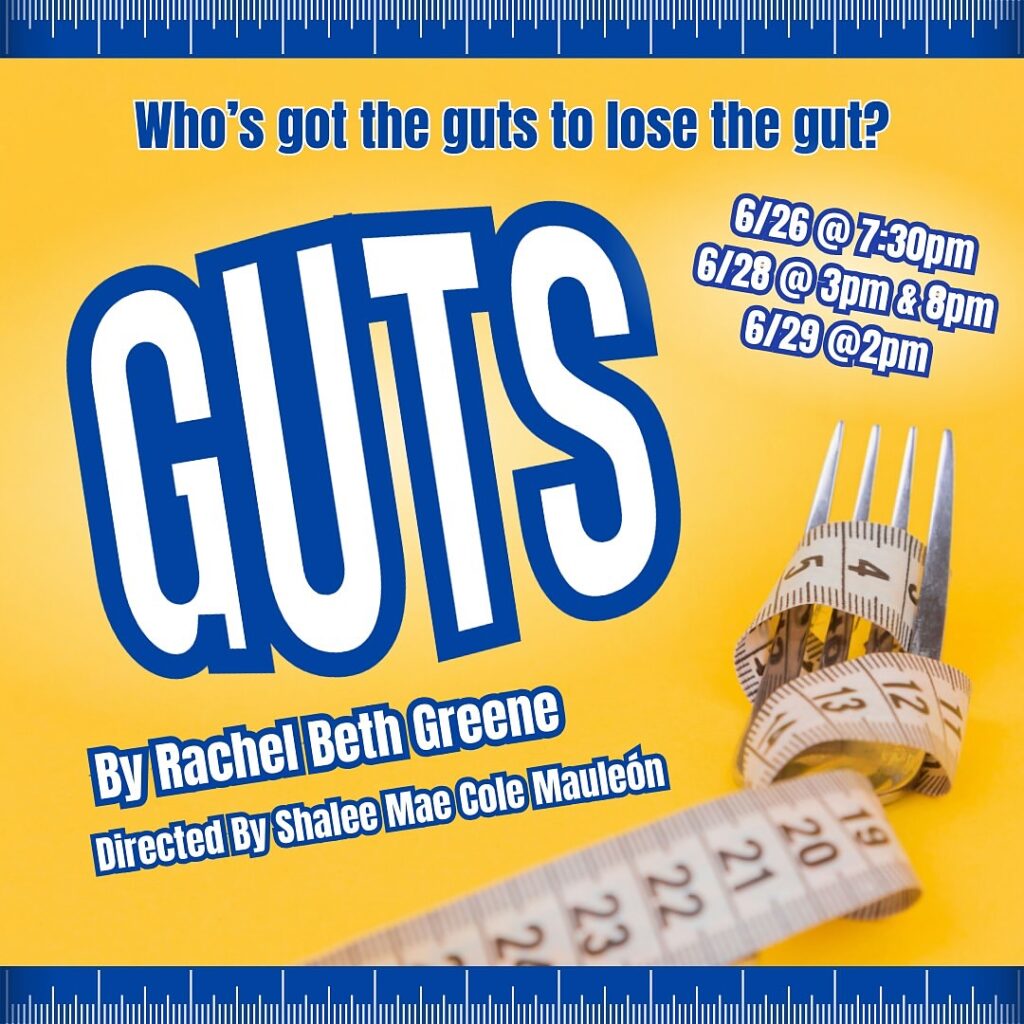 In Guts, six contestants compete on a hit weight-loss reality T.V. show. They seek love and self-healing from their national audience and each other while suffering physical challenges that break the Geneva Conventions and screaming insults online and from their Janus-faced “trainer,” Julia (Gwynnethe Glickman). Led by their fearless leader Darla (Cara Clough) and the show’s spineless intern Jacob (Noah Leikind), the contestants Star (Elijah Brown), Tam (Hailey Madison Sebastian), Jane (Lynn Wilcott), Laurie (Tiffany Santiago), and Tommy (Tim Lawton) see if they have “the guts to lose the gut.”