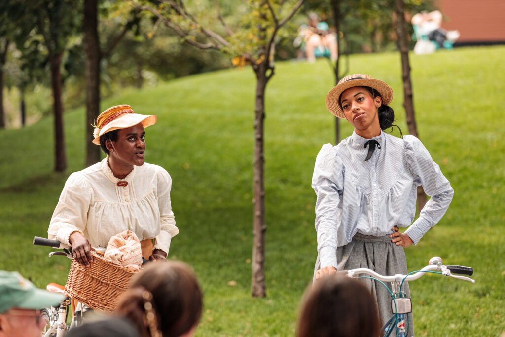 To me, their most impressive feat was Play 3’s bicycle dream ballet. With choreography by Hampton Richards set to the music direction by Nicholas Chieffo, cast members danced with and on their cycles to the spunky musical stylings of a brass and banjo trio. The cast promenaded with their cycles, bowed and dipped in time with the band. It was a charming diversion that referenced the social customs of the day and the ways in which Knox defied them.